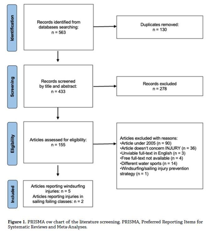 artykuły w języku angielskim dotyczące epidemiologii uszkodzeń narządu ruchu w windsurfingu, żeglarstwie lub klasach opartych na hydrofoilu. Wykluczono badania powtarzające się, niedostępne w pełnym tekście, niezwiązane z dyscyplinami sportowymi lub pozbawione danych o uszkodzeniach.